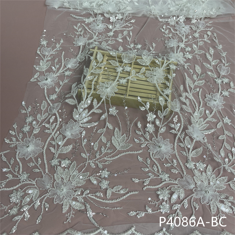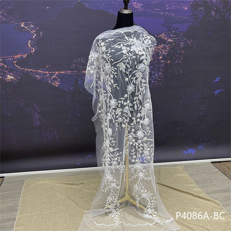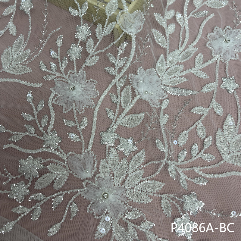 涤纶蕾丝奢华新娘手工串珠3毫米亮片刺绣婚纱面料